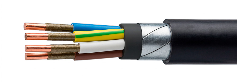 - Проводник тока – медная многопроволочная или однопроволочная жила 1 или 2 класса гибкости в соответствии с ГОСТ 22483. Между металлом и изоляцией термический барьер из слюдяных лент. Разноцветные жилы с изоляцией из сшитого полиэтилена многожильных кабелей свернуты в сердечник. Скрутка покрыта внутренней оболочкой и защищена двумя стальными лентами из оцинкованной стали.
